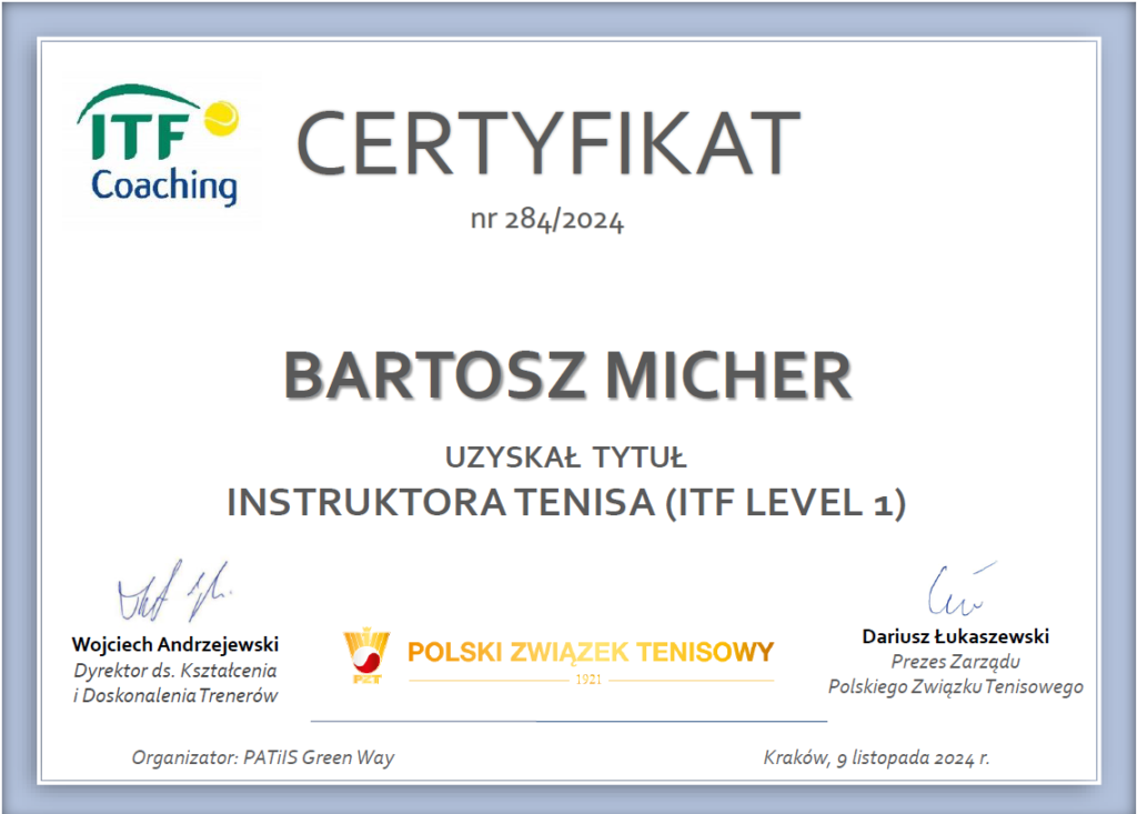 „Gotowi, by podnieść swój poziom gry w tenisa? Jako certyfikowany instruktor tenisa z 20-letnim doświadczeniem w coachingu, oferuję unikalne podejście, które wykracza poza samą technikę. Po tym, jak grałem w tenisa uniwersyteckiego w USA przez cztery lata i rywalizowałem w niemieckich ligach, wnoszę bogactwo wiedzy z kortu. To, co naprawdę wyróżnia moje szkolenie, to integracja psychologii sportu, która pomaga rozwijać nie tylko uderzenia, ale także grę mentalną i pewność siebie na korcie. Miałem zaszczyt pracować z graczami na wszystkich poziomach, od absolutnych początkujących po zaawansowanych zawodników, w wielu klubach oraz poprzez współpracę ze szkołami i przedszkolami. Niezależnie od tego, czy preferujesz lekcje indywidualne, czy grupowe, jestem oddany pomaganiu Ci w osiągnięciu Twoich celów tenisowych i odblokowaniu pełnego potencjału.” Prowadzę treningi tenisa na kortach w Wieliczce oraz w południowych dzielnicach Krakowa.